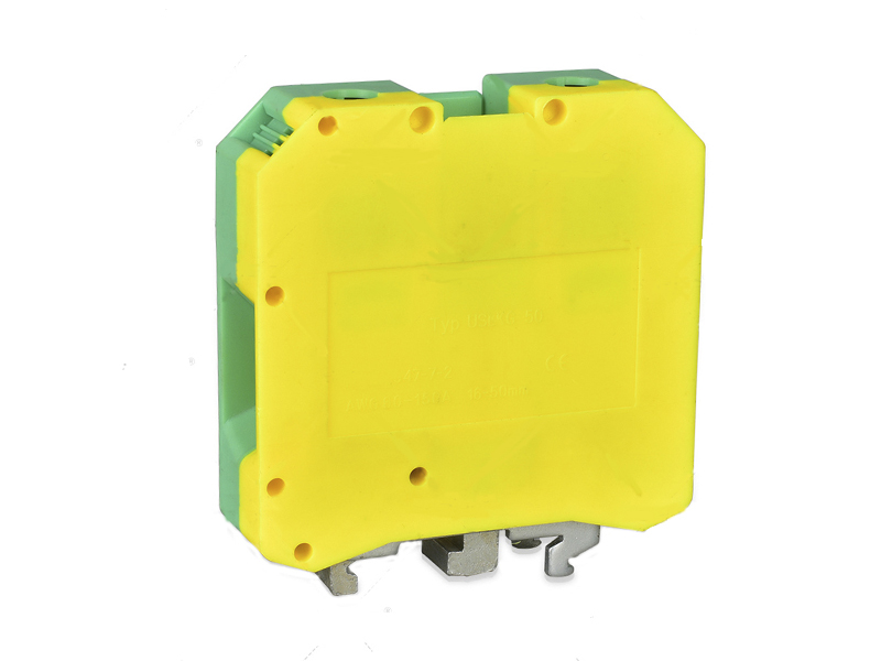USLKG50接地端子,接線方式:螺釘連接,連接量: 2,位數(shù): 1橫截面:16 mm?-50 mm?,AWG:6-1/0,寬度: 20 mm,顏色: 黃綠相間,導(dǎo)軌安裝方式: NS 35/7.5,NS 35/15,NS 32,USLKG50是黃綠接地端子可以搭配UK50平方以內(nèi)的所有端子,接地線使用。